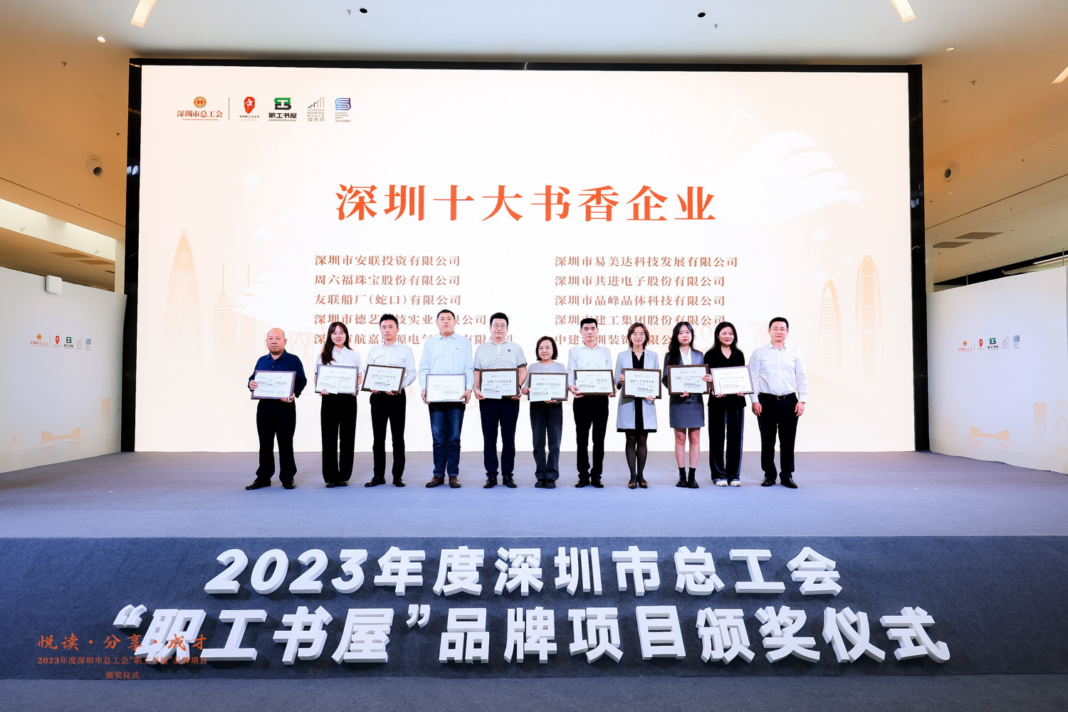 12月15日下午,由深圳市总工总主办、深圳出版集团承办的2023年度深圳市总工会“职工书屋”品牌项目颁奖仪式在深圳中心书城南区大厅举行。经过前期申报,坪山区总工会推荐,专业委员会评选,我司荣获第十七届“深圳十大书香企业”。深圳十大书香企业是由深圳市总工会、深圳市精神文明建设委员会办公室、深圳读书月组委会办公室联合发起评选的,每年在全市范围内只评选出十家书香企业,具有较高的权威性。