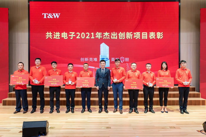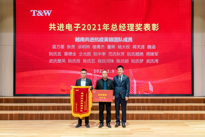 下午,大会继续召开。公司在大会上隆重表彰30个杰出创新项目,公司总经理胡祖敏、副总经理汪澜、副总经理龚谱升、网通事业部执行副总经理魏洪海分别简要汇报了公司重点创新项目。同时胡总向越南共进抗疫英雄团队颁发了总经理奖。奖金为10万元。2021年越南新冠肺炎疫情全面爆发,越南共进全体员工守职尽责,排除万难,赶时间,抢产能,尽一切努力组织生产,保交付。为表彰先进人物,弘扬拼搏精神,经总经理决定,颁发这个总经理特别奖。